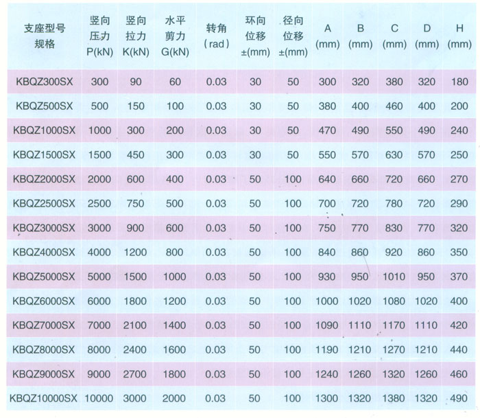 4 KBQZ系列抗拔球型支座 本系列支座主要分為抗拔球型支座和減震抗拔球型支座,下面對(duì)其進(jìn)行分類介紹。4.1抗拔球型支座 此類支座分為固定型、單向位移型和雙向位移型,支座結(jié)構(gòu)如圖3。其主要由支座頂板、不銹鋼板、平面聚四氟乙烯滑板、球冠襯板、球面聚四氟乙烯滑板、中支架、聚四氟乙烯滑板、不銹鋼板和滑移箱組成。支座中的相對(duì)滑移部件之間,采用目前世界上摩擦系數(shù)最低的聚四氟乙烯滑板和不銹鋼板相隔,充分減小了摩擦阻力,使各部分之間的運(yùn)動(dòng)流暢,避免爬行現(xiàn)象的產(chǎn)生。本類支座通過球面聚四氟乙烯滑板上部構(gòu)件沿著球面相對(duì)于下部構(gòu)件的轉(zhuǎn)動(dòng)實(shí)現(xiàn)轉(zhuǎn)角(常用值為0.02rad),在工作過程中支座沿著滑移箱滑道滑動(dòng)實(shí)現(xiàn)水平位移。 豎向壓力的傳遞是通過支座頂板,不銹鋼板,平面聚四氟乙烯滑板,球冠襯板,球面聚四氟乙烯滑板,中支架,聚四氟乙烯滑板,不銹鋼板依次疊加傳至滑移箱底板。 豎向拔力的傳遞是通過支座頂板和中支架的抗拔接觸面將作用于支座頂板上的上.拔力傳至中支架,再由中支架與滑移箱之間的抗拔四氟滑板和不銹鋼板將力傳至滑移箱頂板。 水平力的傳遞是通過支座頂板側(cè)壁與中支架側(cè)壁之間.的接觸面將水平力傳至中支架,再由中支架與滑移箱的接觸面?zhèn)髦粱葡鋫?cè)壁根部。 固定型抗拔球型支座不設(shè)滑移箱。4.1.1普通抗拔雙向位移型球型支座KBQZ-SX普通抗拔雙向位移型球型支座參數(shù)表 表74.1.2普通抗拔單向位移型球型支座KBQZ-DX普通抗拔單向位移型球型支座參數(shù)表 表84.1.3普通抗拔固定型球型支座KBQZ-GD普通抗拔固定型球型支座選用參數(shù)表 表9